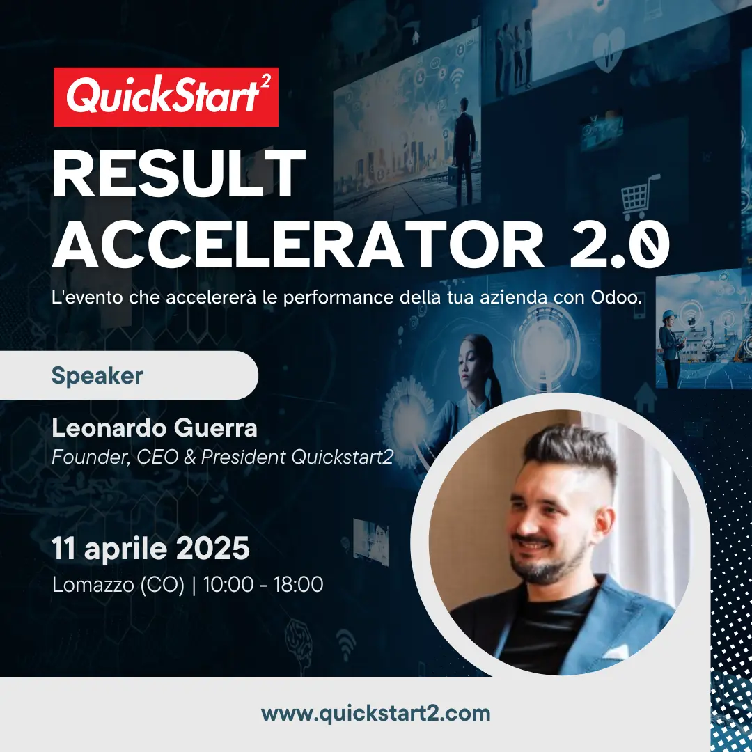 Nella giornata di Result Accelerator 2.0 scoprirai come far performare la tua azienda con Odoo. Sarà una giornata di formazione a Lomazzo, nella cornice del Parco Scientifico Tecnologico ComoNext, in cui parleremo approfonditamente di: